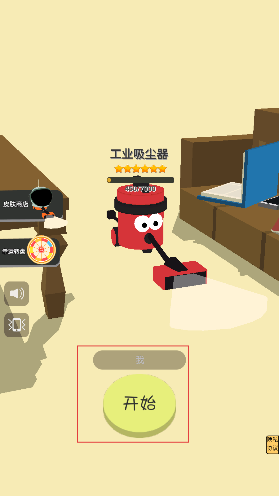 1、玩家在游戲主界面,點擊綠色的開始按鈕,進入游戲對局,操控工業吸塵器角色開始清掃任務。