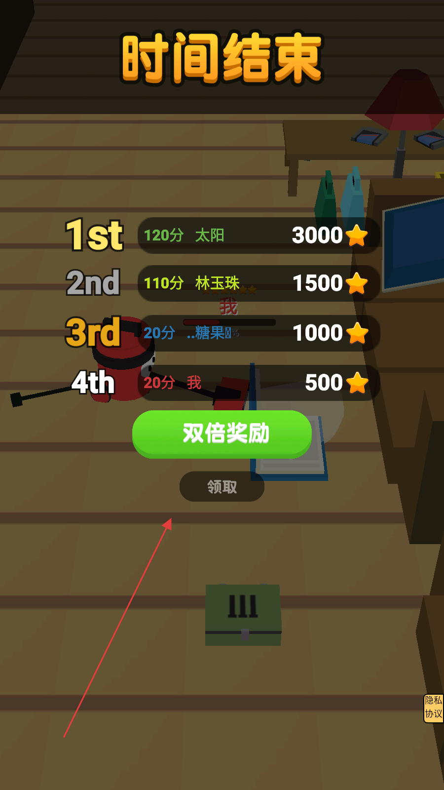 4、游戲時間結束后,查看排名界面了解自己的游戲成績和獲得的獎勵星星數量,點擊領取按鈕獲取相應獎勵。