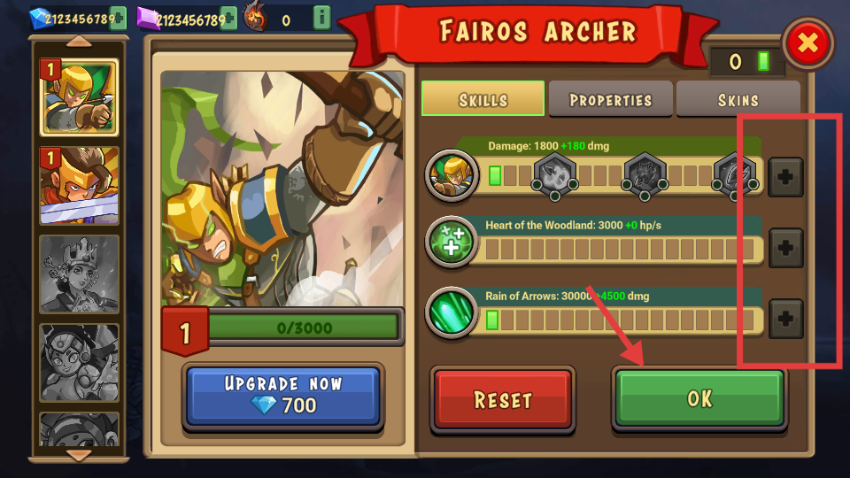 2、進入角色界面可查看弓箭手等英雄的技能、屬性等,調整技能配置后點擊OK確認,也能消耗鉆石升級英雄提升戰力。