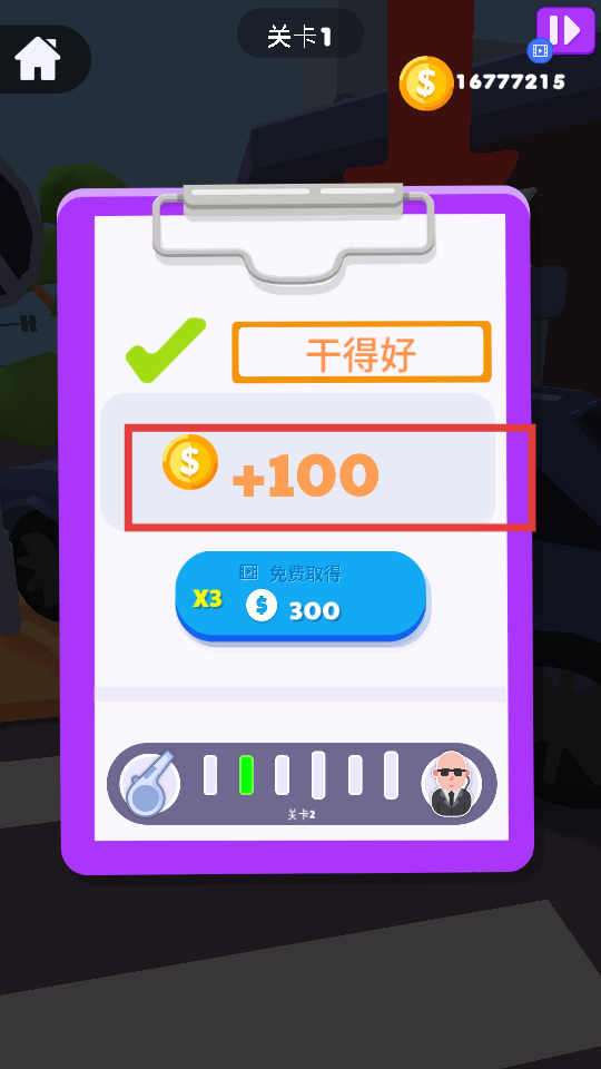 4、成功開具罰單后,會彈出結算界面,顯示干得好并獲得金幣獎勵,也可選擇免費取得等方式獲取更多金幣,助力玩家后續游戲。