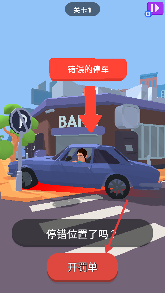 2、在關卡中若發現車輛錯誤停車,會出現開罰單按鈕,點擊該按鈕即可對違規停車的車輛開具罰單,開始履行執法職責。