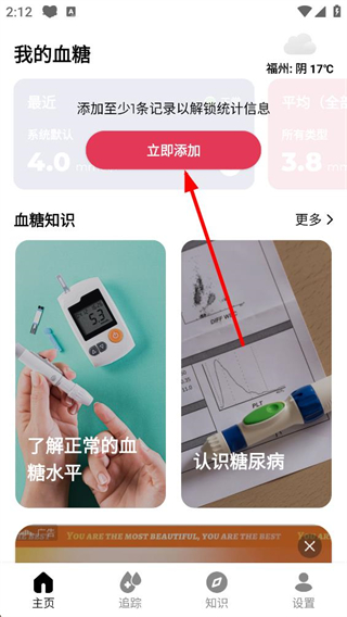 2、進入應用首頁,顯示我的血糖模塊,提示添加記錄解鎖統計信息,點擊立即添加按鈕,進入新記錄的編輯頁面。