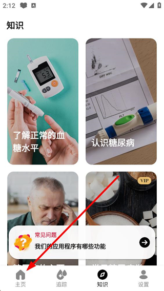 1、進入應用的知識頁面,可見了解正常血糖水平、認識糖尿病等知識模塊,點擊底部首頁按鈕,進入應用的首頁界面。