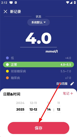 3、進入新記錄頁面,可查看血糖狀態對應的區間,設置記錄的日期與時間后,點擊保存按鈕,完成這條血糖記錄的添加。