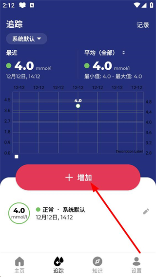4、保存記錄后進入追蹤頁面,能查看已記錄的血糖數據及統計圖表,點擊增加按鈕,可繼續添加新的血糖記錄。