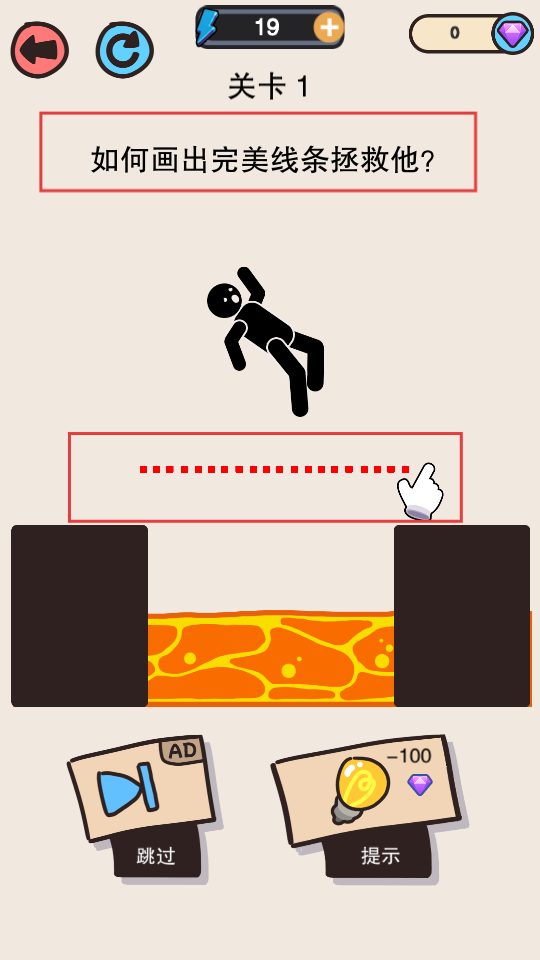 2、在關卡里按照提示用手畫出線條,要讓線條能接住掉落的火柴人,避免他掉入危險區域,畫的時候需注意線條的位置和形狀。