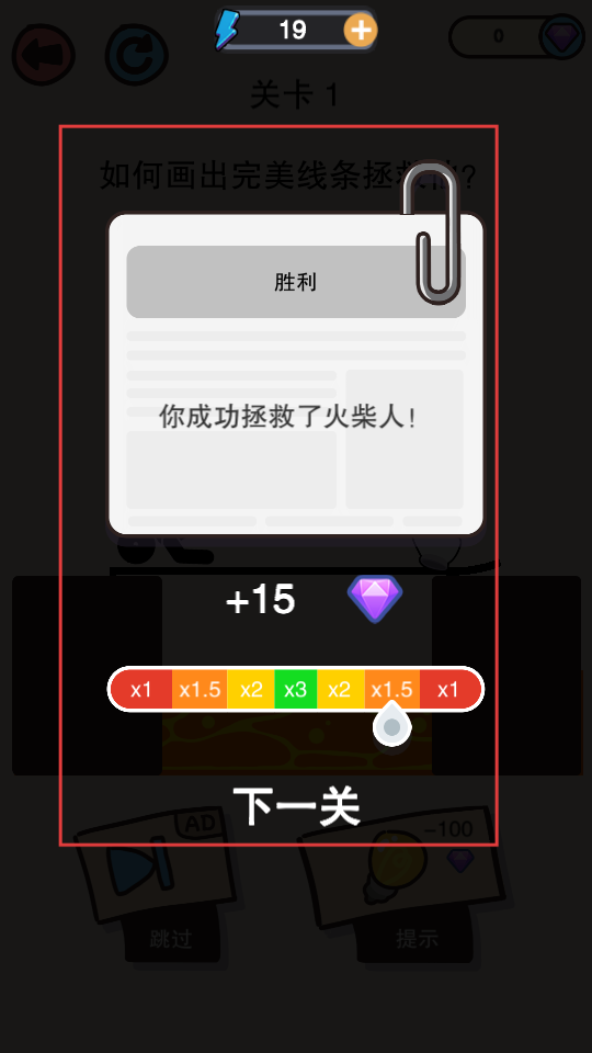 4、救援成功后會彈出勝利界面,顯示成功拯救火柴人,還能獲得鉆石獎勵,之后點擊下一關按鈕,繼續新的救援挑戰。