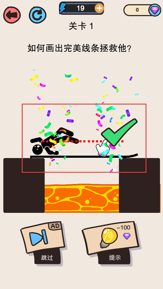 3、成功畫出合適線條后,火柴人會落在線條上,此時會有彩色紙屑等效果,表明救援初步成功,接著等待后續判定。