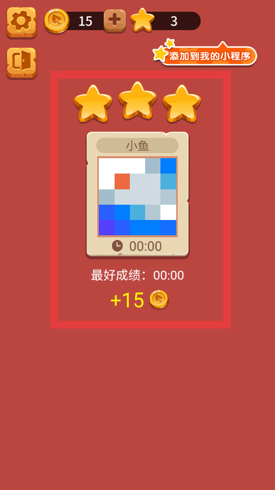 4、完成關卡后,會顯示獲得的星星數量、圖案以及金幣獎勵,還能看到最好成績,同時可選擇添加到我的小程序,方便后續快速進入游戲。