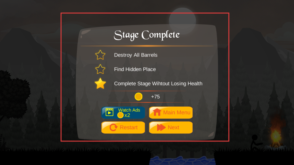 4、通關后,會顯示結算界面,這里有任務完成情況和獎勵,可選擇點擊Main Menu返回主界面,也能點Restart重玩,或點Next進下一關。