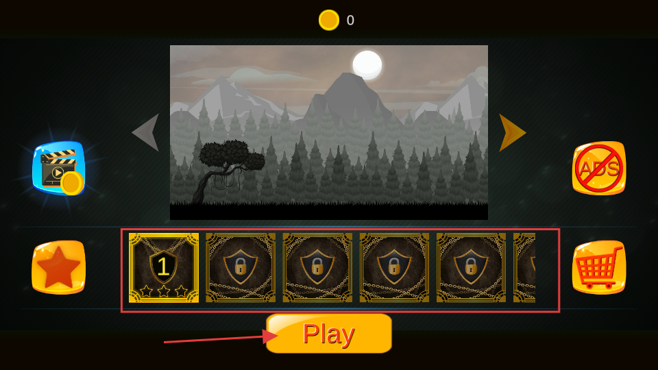2、進入關卡選擇界面,能看到多個帶鎖或標有數字的關卡圖標,選擇標有1的關卡,再點擊Play按鈕,就可以開啟第一關。