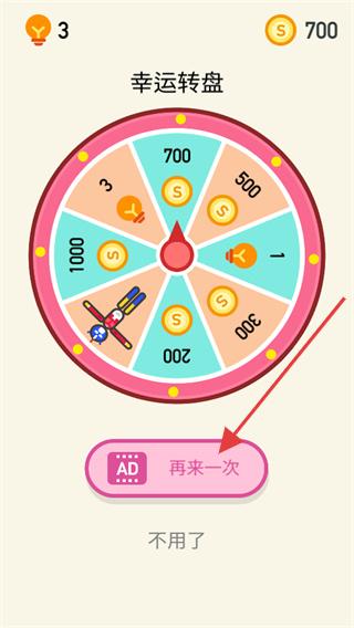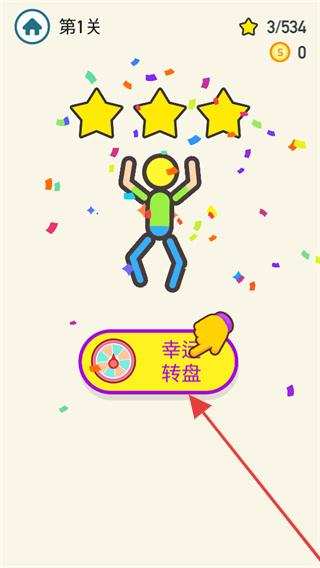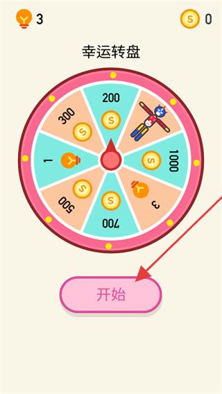3、通關后點擊幸運轉盤按鈕,進入幸運轉盤界面,然后點擊開始按鈕,轉動轉盤,有機會獲得金幣等獎勵。