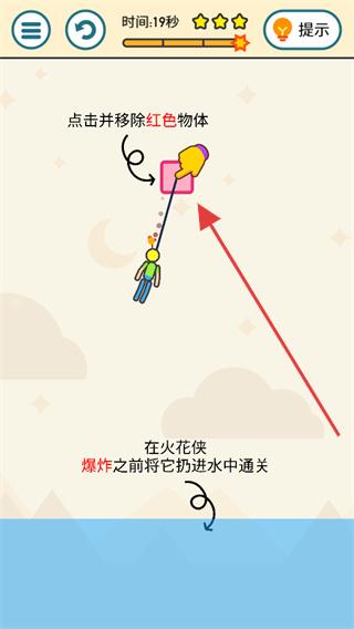 1、進入游戲看到有火花俠和紅色物體的關卡場景,根據提示點擊紅色物體,將其移除,為后續把火花俠扔進水中做準備。