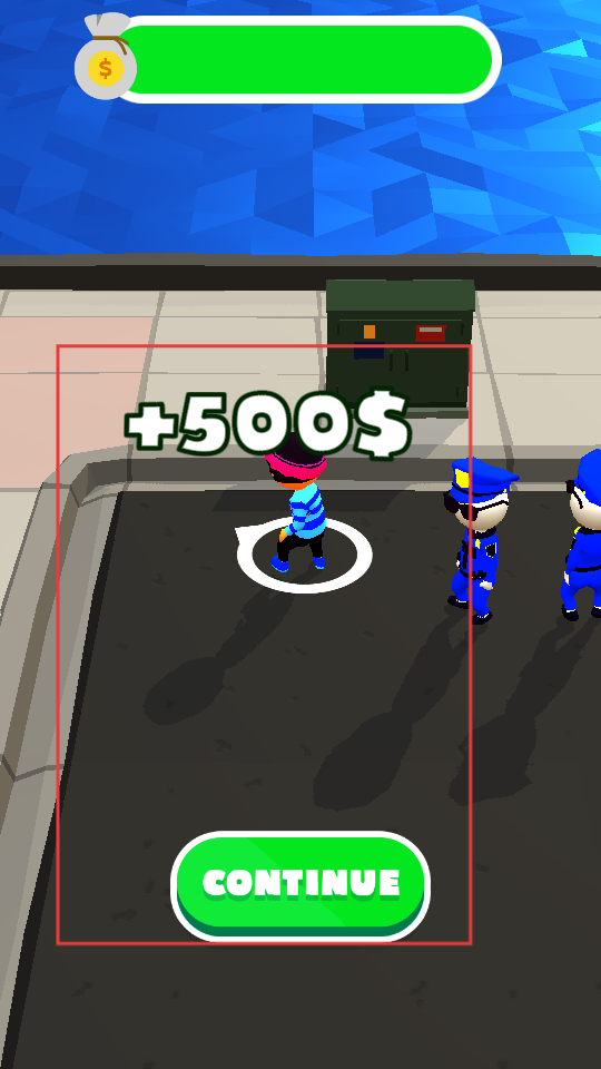 4、成功收集足夠鈔票后,會獲得大量獎勵,點擊CONTINUE按鈕,繼續下一輪游戲,挑戰收集更多鈔票。