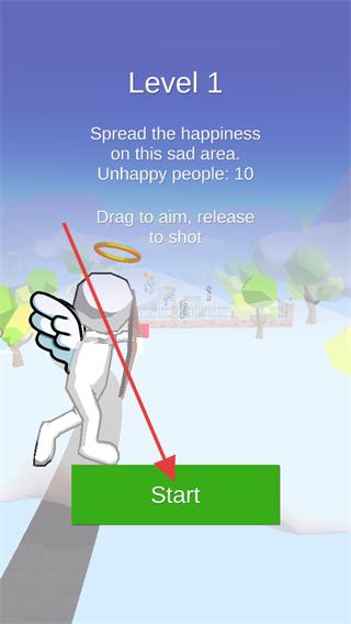 1、進入游戲看到帶有Start按鈕的界面,點擊該按鈕,進入第一關,操控天使開始在場景中移動,準備進行射箭傳遞快樂任務。
