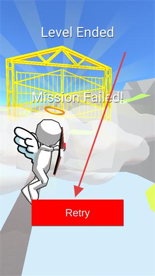 4、若任務失敗出現MissionFailed提示,點擊Retry按鈕重新開始關卡,再次操控天使移動、瞄準、射箭,直至成功傳遞快樂。
