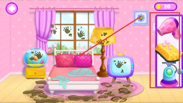 3、進入臟亂的房間后,根據右側提供的清潔工具,對房間內有污漬的物品進行清潔操作,讓房間變得整潔。