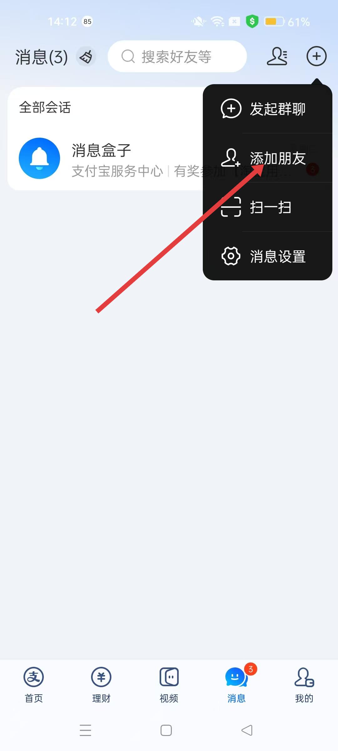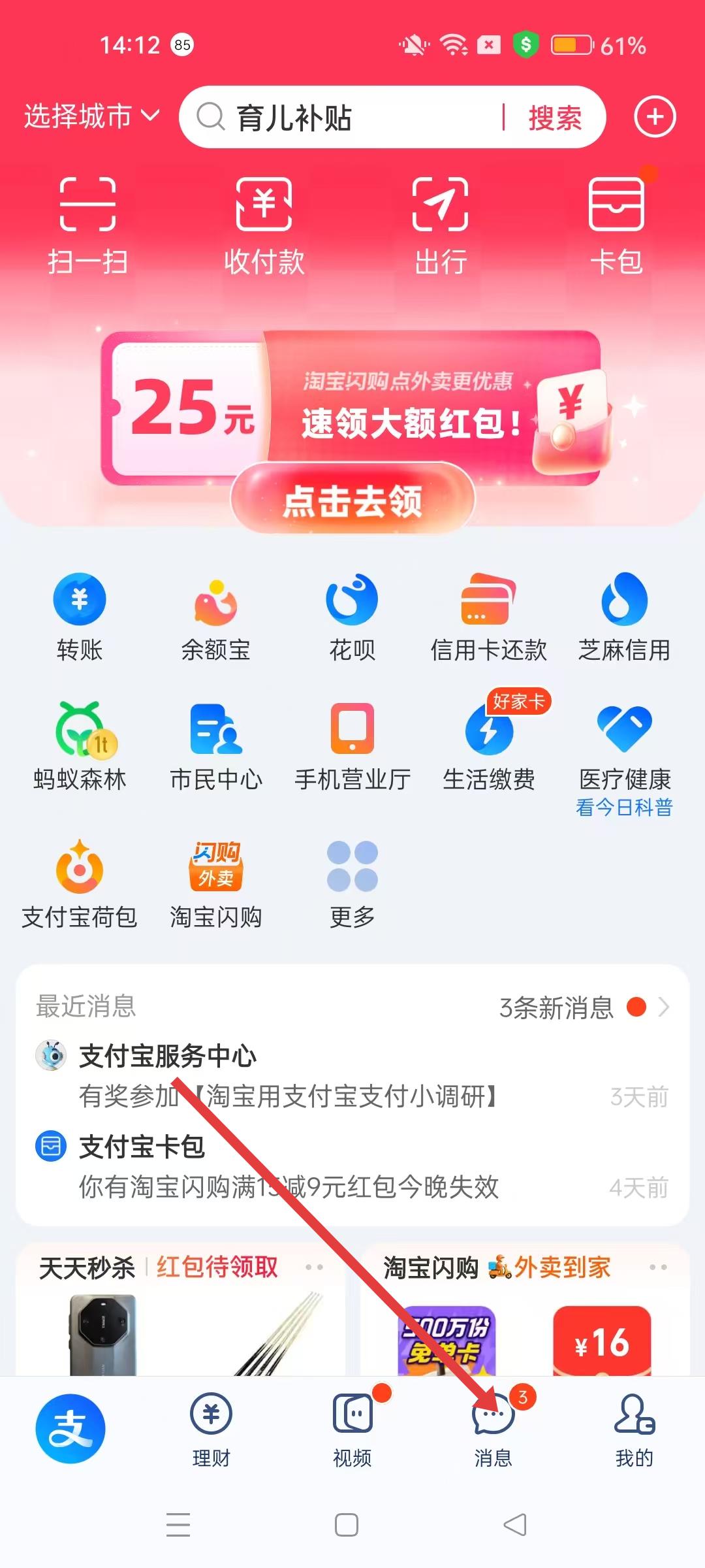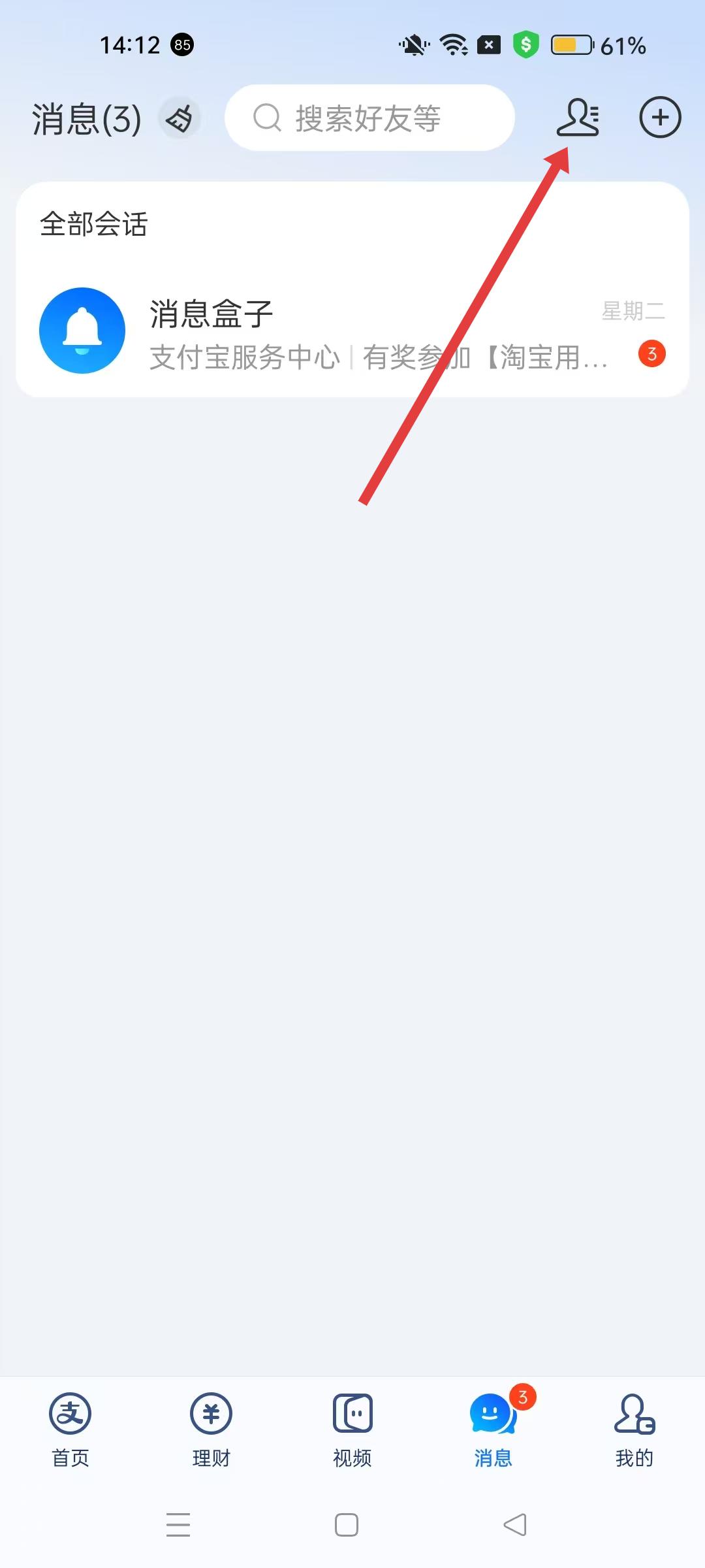1、打開支付寶APP進入首頁,點擊下方消息,進入消息頁面,開始添加朋友流程。