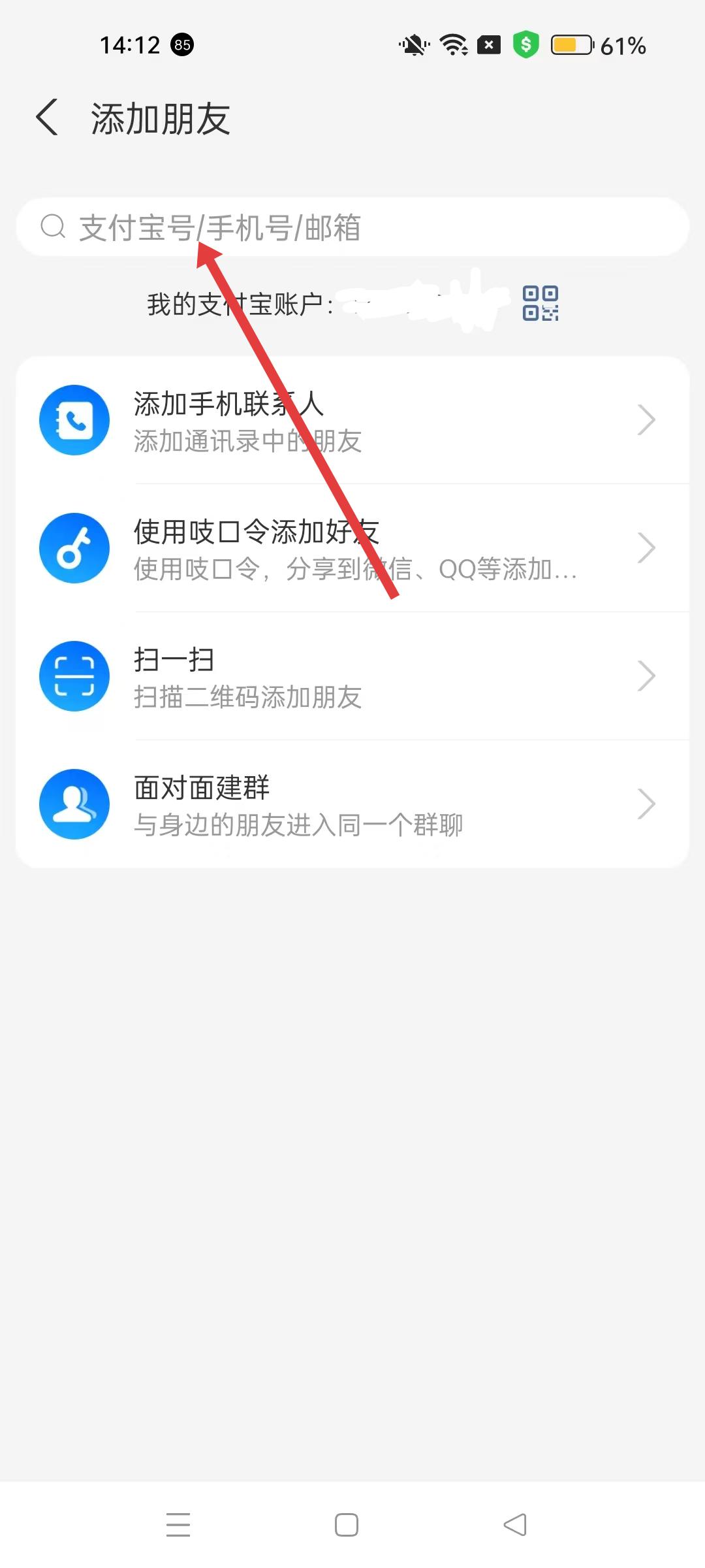3、添加朋友頁面可通過搜索支付寶號、手機號、郵箱,或選擇添加手機聯系人、使用吱口令、掃一掃等方式添加朋友,方便用戶拓展支付寶社交關系。