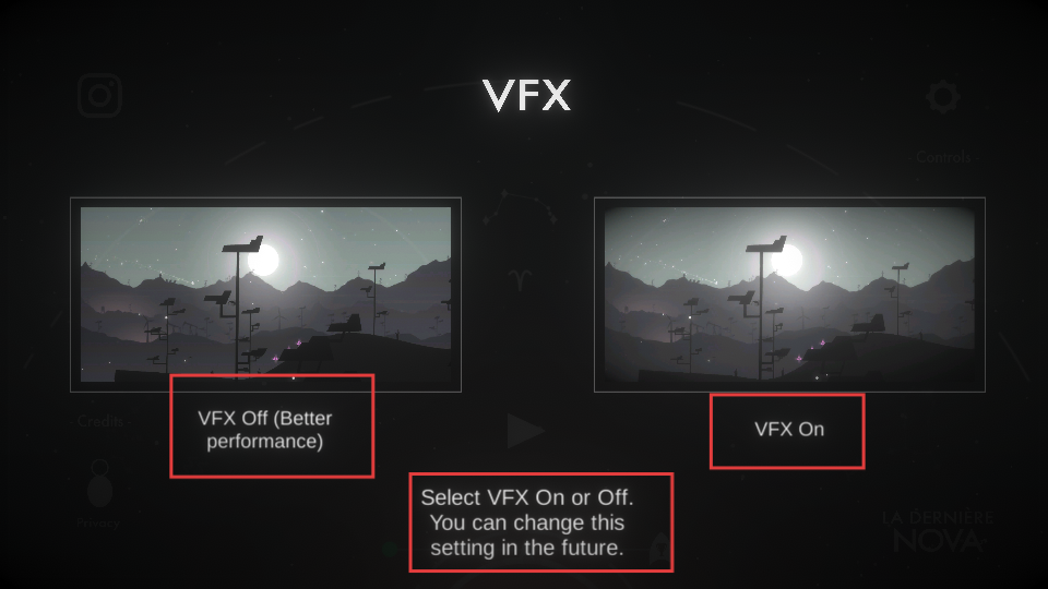 1、進入游戲,先在VFX設置界面,選擇VFX On或VFX Off,可根據設備性能調整,之后開始游戲。