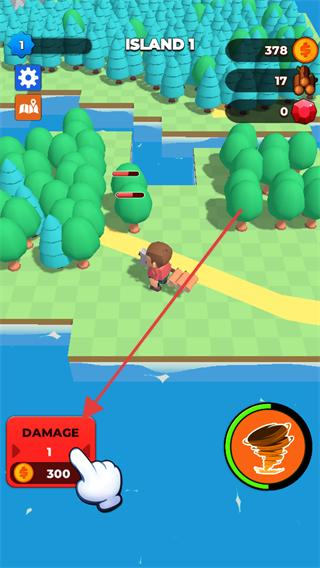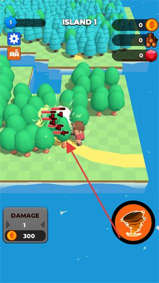 4、隨著伐木進行角色的伐木傷害會提升,繼續操控角色在島嶼上尋找樹木,使用技能伐木,積累更多的木材等資源,探索島嶼的更多區域。