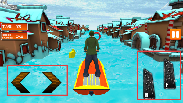 2、通過屏幕左側的左右方向按鈕控制摩托艇轉向,右側的R倒車和F前進踏板控制摩托艇的進退,在水面上靈活駕駛。