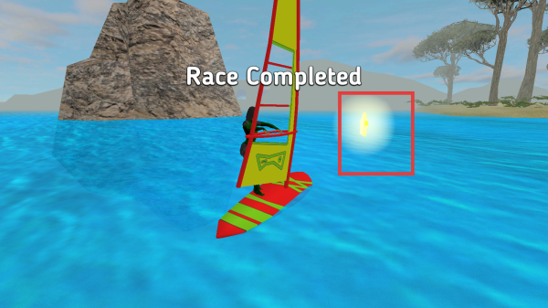 3、操控水上帆板在水面上行駛,參與水上競賽,沿著指定路線前進,爭取率先到達終點,完成Race Completed競賽完成的目標。