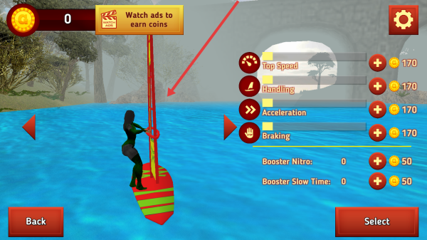 2、在裝備選擇界面,可查看水上帆板等裝備的各項屬性,使用金幣對這些屬性進行提升,優化裝備性能,為比賽或航行做好準備。