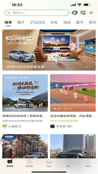 1、首頁,聚焦廣州車展,展示傳祺E8全運版限量發售、M8宗師空間優勢,同步關聯全運會話題,是品牌資訊的展示入口。