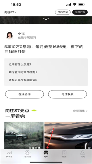 3、購車功能頁,展示向往S7車型,提供5年10萬0息購政策,支持咨詢訂單,呈現車型亮點,輔助用戶購車決策。