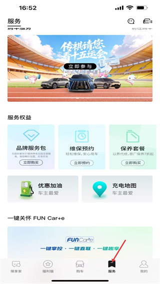 4、車主服務頁,含維保預約等權益,提供加油、充電工具,關聯全運會活動,是車主獲取用車服務的核心板塊。