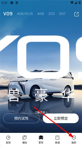 1、進入應用后可看到車型展示界面,頂部有不同車型選項,界面展示車輛信息及預約試駕立即預定按鈕,底部導航欄有我的選項,點擊可進入個人界面。