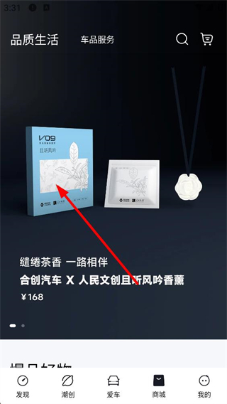4、進入商城界面可看到品質生活相關商品,如合創汽車聯名香薰等,展示商品信息及價格,可商城內瀏覽或選購相關車品周邊。