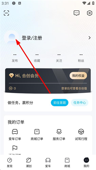 2、點擊我的選項后進入個人界面,這里有登錄、注冊入口,還有合創會員權益展示及做任務贏積分等板塊,可進行賬號相關操作。