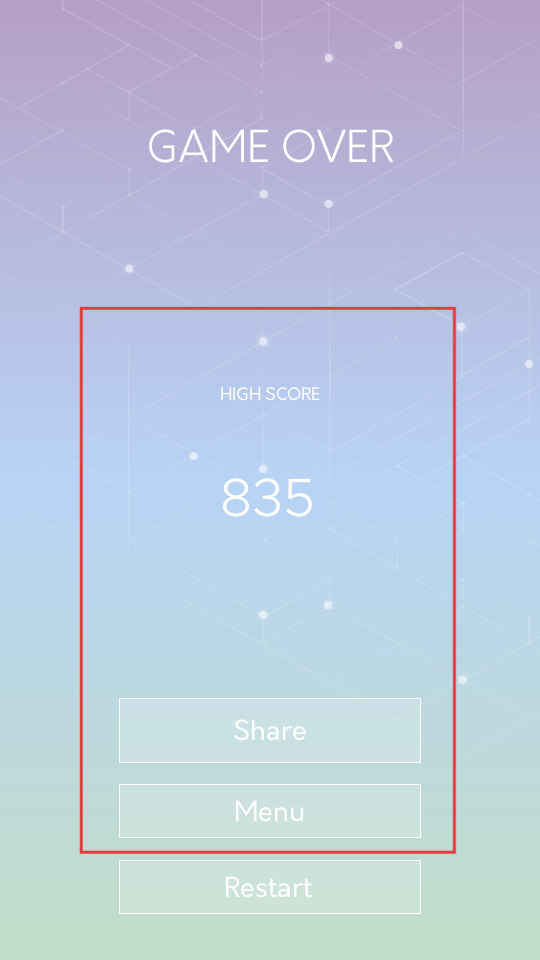4、游戲結束后,會顯示高分,可選擇Share分享成績,或點擊Menu回到菜單,也能按Restart重新開始游戲,挑戰更高分數。