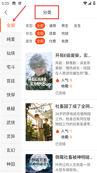 3、分類模塊頁面,按多維度篩選內容,覆蓋純愛、仙俠等品類,助力用戶精準查找目標內容。