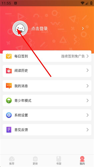 2、個人中心界面,能看到點擊登錄入口及每日簽到閱讀歷史等功能選項,點擊該登錄入口,可進入登錄界面選擇對應的登錄方式。