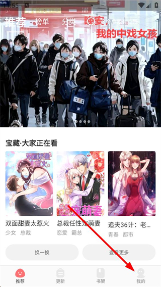 1、進入漫畫閱讀應用推薦界面,可查看大家正在看的漫畫內容,點擊底部我的選項,即可進入個人中心界面,準備進行賬號相關操作。
