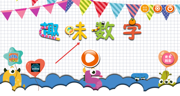 1、此為趣味數字應用啟動頁,顯示主題名稱,設播放按鈕,含數字城堡等功能入口,右側有更多精彩按鈕,可進入數字學習內容。