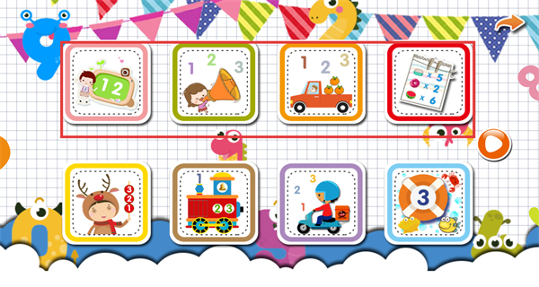 2、內容分類頁,展示多個數字學習單元,以卡通場景呈現,涵蓋數字認讀與運算練習,助力兒童場景化接觸數字知識。