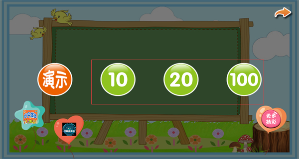 3、數值選擇界面,提供10、20、100等選項,左側設演示按鈕,用于選擇學習難度,演示功能輔助理解數值概念。