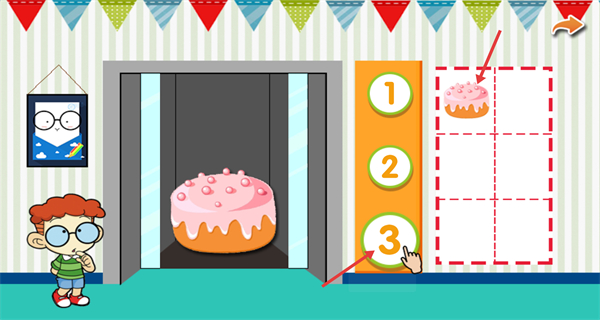 4、互動操作頁,點擊數字按鈕可將物品放入網格,以互動形式訓練兒童數字對應與空間認知能力,提升學習參與感。