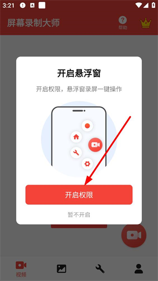 2、點擊錄屏按鈕后彈出開啟懸浮窗的彈窗,說明開啟權限可實現懸浮窗一鍵錄屏,可選擇點擊開啟權限或暫不開啟該功能。