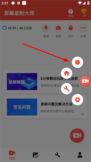 4、開啟懸浮窗權限后,界面顯示含錄屏主頁等功能的懸浮窗,可通過該懸浮窗快速進行錄屏及相關功能的操作。