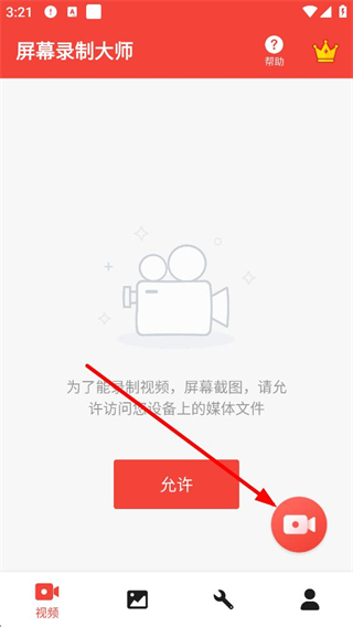 1、進入屏幕錄制大師界面,提示需允許訪問設備媒體文件以進行錄屏,點擊允許授予權限,點擊右側錄屏按鈕可啟動錄屏相關操作。