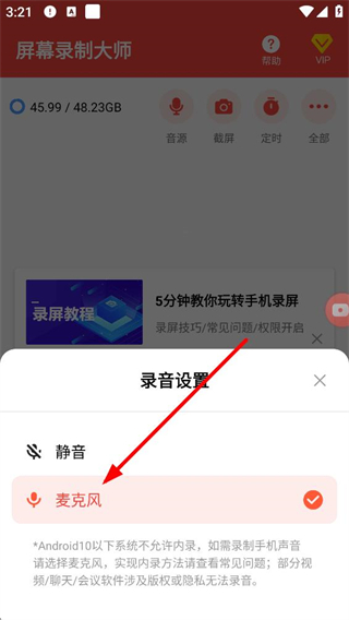 3、錄屏前彈出錄音設置彈窗,提供靜音和麥克風選項,當前選擇麥克風,同時說明系統版本對錄音的限制及部分軟件無法錄音的情況。