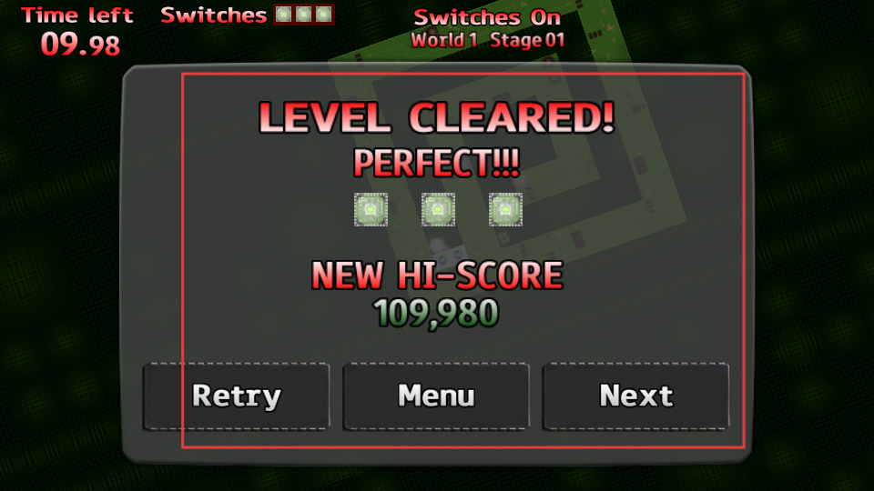 4、成功通關后,會顯示LEVEL CLEARED等提示,還有新的高分記錄,此時可選擇Retry重新玩這關,或選Menu回到主菜單,也能點擊Next進入下一關。