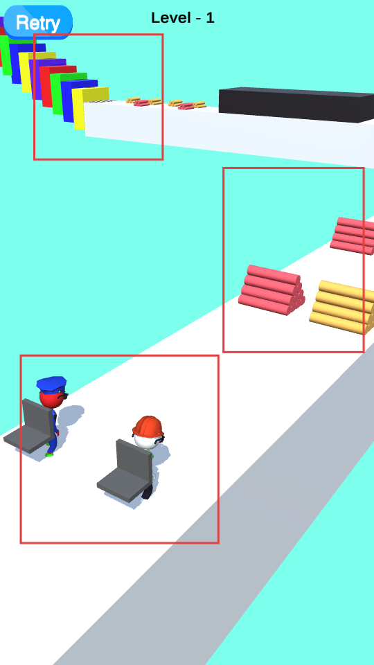 1、在第一關時,操控角色在場景里移動,收集不同顏色的圓柱,同時留意其他角色,盡量多收集圓柱,為后續搭建爬梯做準備。