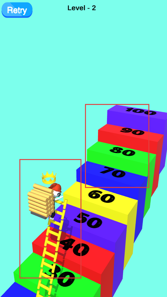 3、當收集到足夠圓柱后,利用圓柱搭建爬梯,沿著帶有數字的彩色臺階向上攀爬,朝著更高的數字臺階前進,爭取到達更高處。