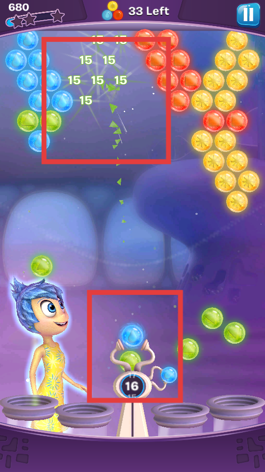 2、游戲時,操控發射器發射彩色泡泡,瞄準上方同色泡泡區域發射,讓泡泡碰撞消除,注意剩余泡泡數量,合理規劃發射。